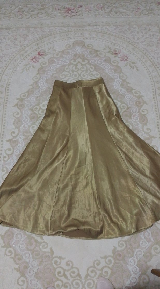 Bej renkli, parlak ve saten görünümlü uzun etek. Dökümlü tasarımı ve bol kesimiyle klasik, vintage tarza sahiptir. ✨ çan etek içi astarlı