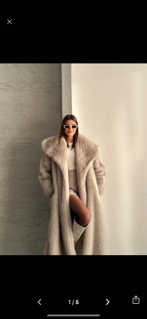 Bej renkte uzun peluş kaban, yüksek yakalı ve bol kesimdir. Kürk detaylarıyla rahat ve şık bir sokak stili sunar. Marka temsilidir