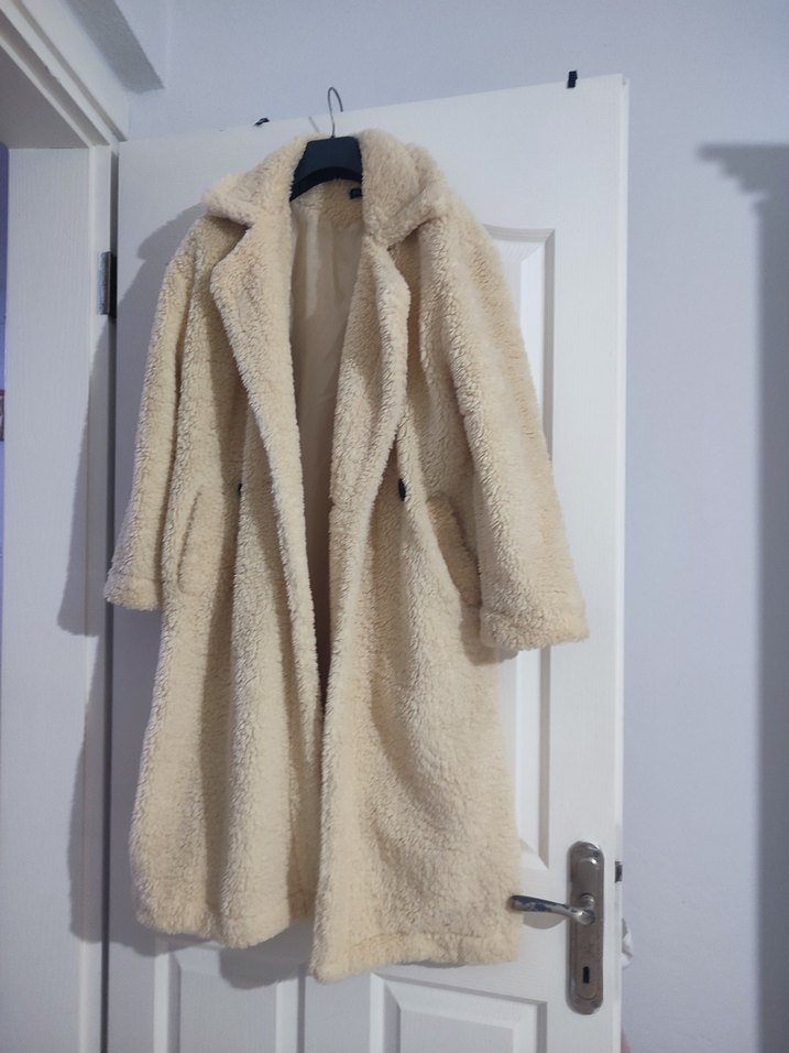 Bej renkli, uzun boy, peluş dokulu, kürk detaylı, uzun kollu, rahat kesim kadın kaban. Sokak modasına uygun, gündelik kullanıma ideal.