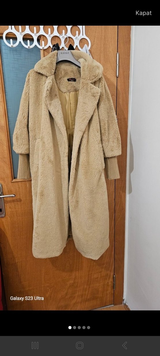 Bej renkli, uzun peluş kumaştan yapılmış, kürk detaylı, notlu yaka ve bol kesimli kaban. Uzun kollu ve ribanalı manşetlere sahip, rahat sokak stiline uygun.