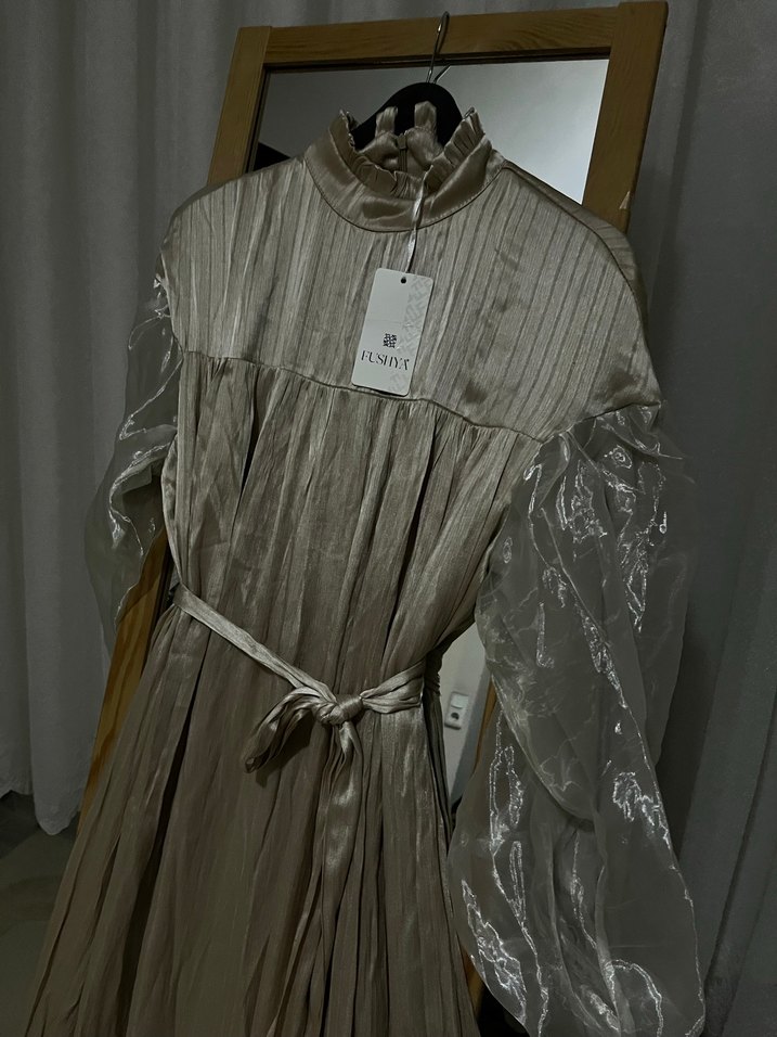 Bej renkte uzun pilili elbise, yüksek yakalı ve transparan askılı kollara sahiptir. Bol kesimli, bohem tarzda ve düğünler için uygundur. Yumuşak sentetik kumaştan üretilmiştir.