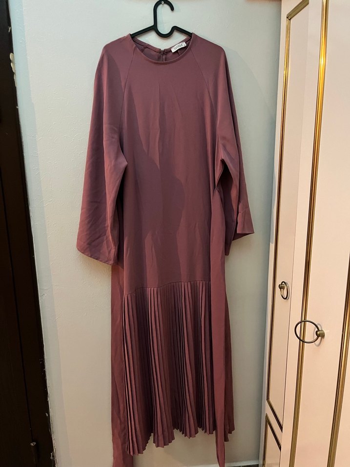 Bej renk, uzun kollu, yuvarlak yakalı ve pilili etekli uzun elbise. Rahat kesimli, minimalist ve sade tarzda günlük kullanıma uygun.