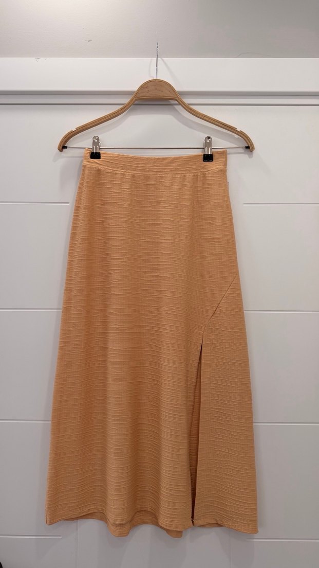 Bej renkli, uzun pilili ve regular fit kadın eteği, yumuşak keten kumaştan yapılmıştır. Minimalist ve çağdaş tarzıyla günlük kullanıma uygundur. Yırtmacı vardır.