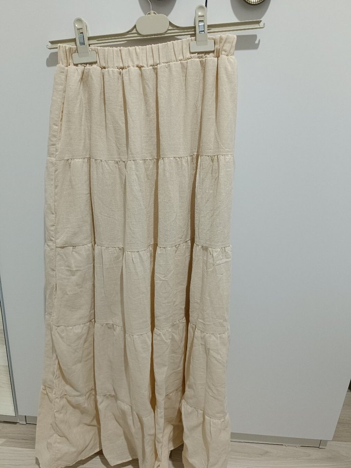 Yumuşak keten kumaştan, bol kesim ve pilili tasarıma sahip bej uzun etek, bohem tarz için uygundur.