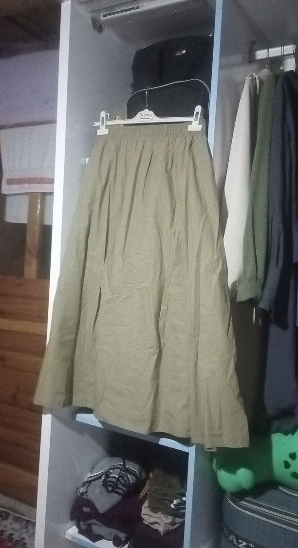 Bej renkli, keten kumaştan, pilili ve bol kesim uzun etek. Günlük kullanıma uygun, minimalist tarzda.