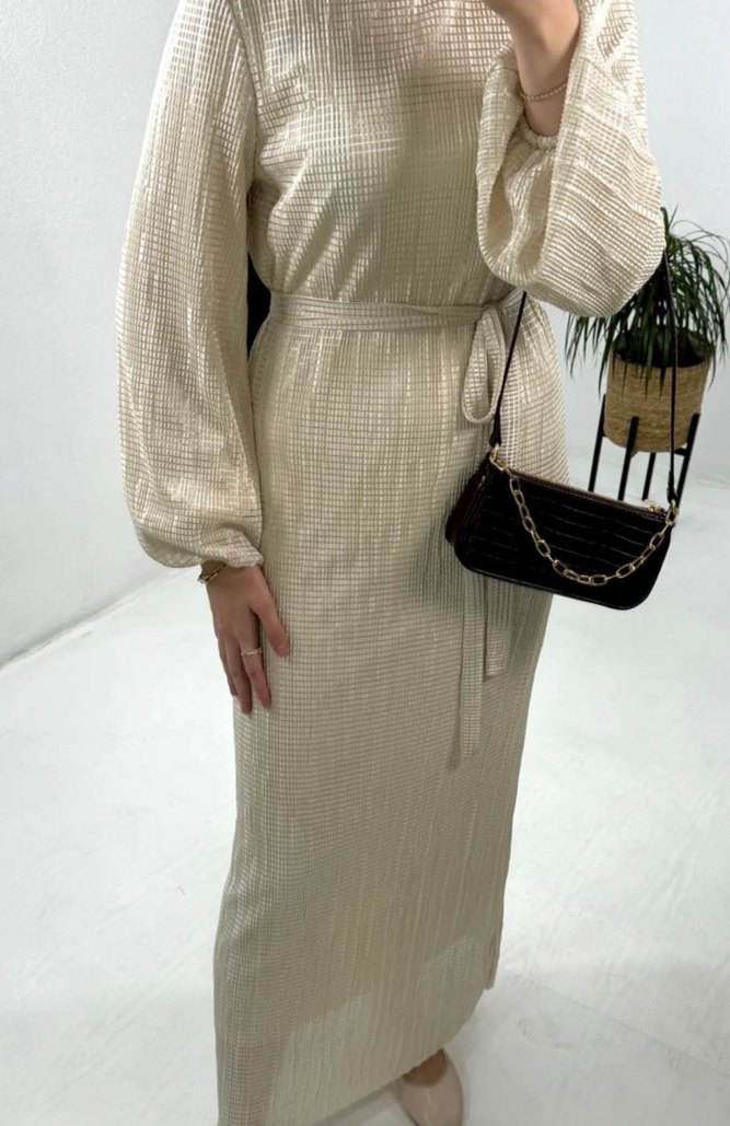 bej renkli, piliseli, sentetik kumaştan uzun elbisesi, bol kesim ve yüksek yakalıdır, günlük ve özel günde kullanım için uygundur.