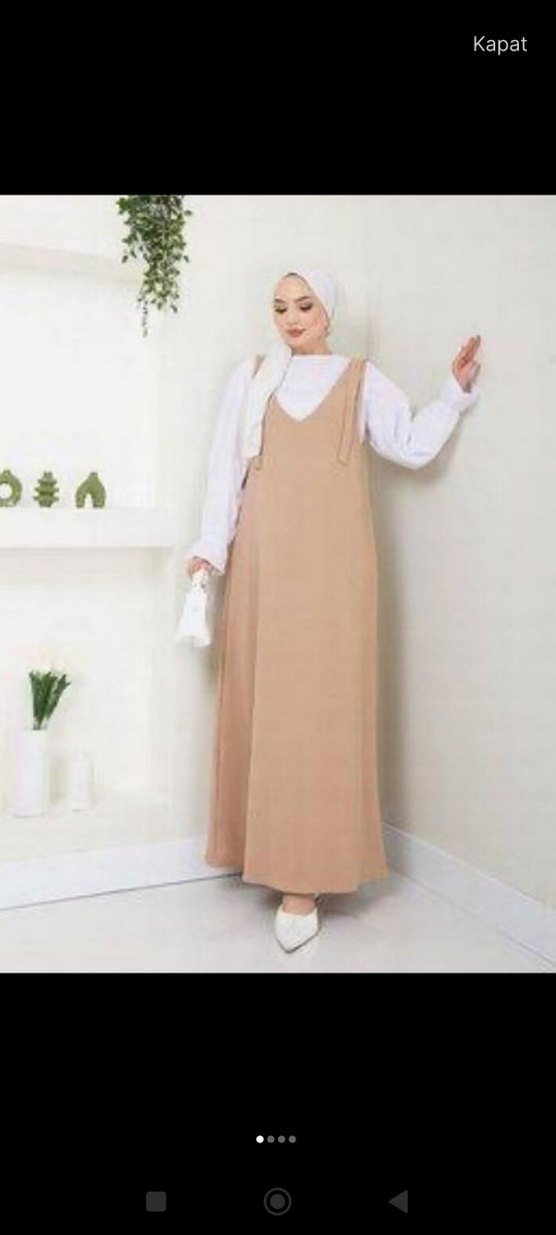 Bej renk, uzun ve salaş kesim askılı elbise, düz ve sentetik dokulu kumaştan üretilmiştir. 44 beden ama 42 bedene göre iki yandan dikiş atıldı açılabilir 42-44 beden uyumlu küçük bir yerde ip çekilme var o kadar başka bir şey yok
