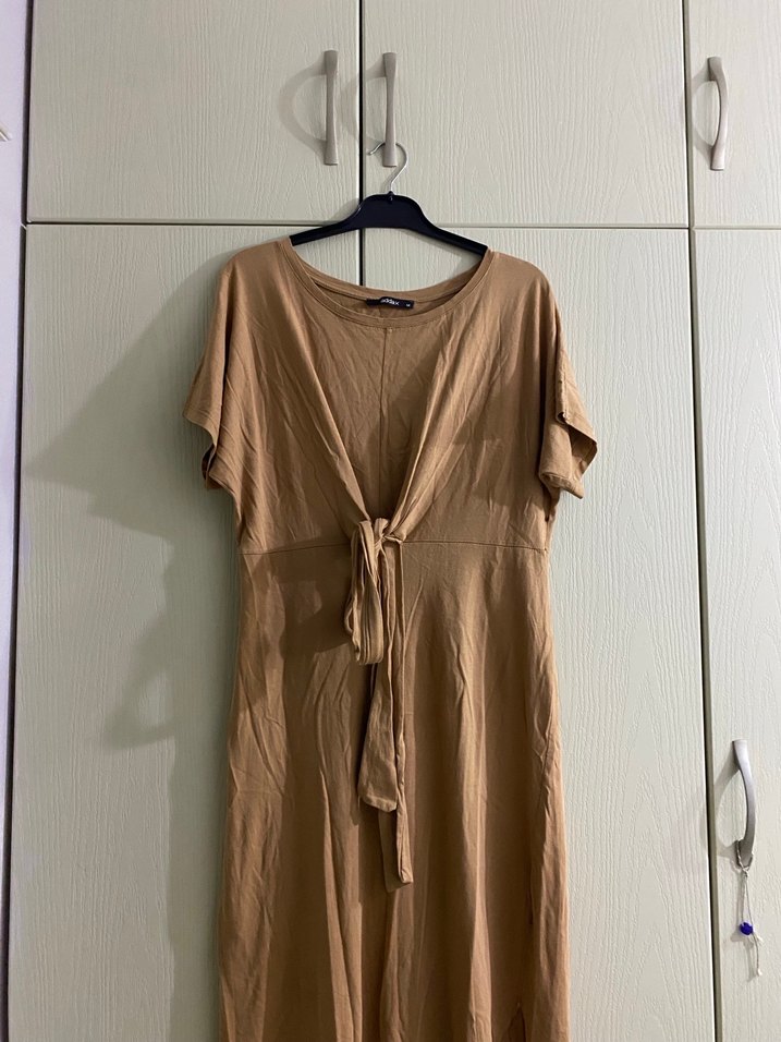 Bej Uzun Salaş Bağlamalı Elbise