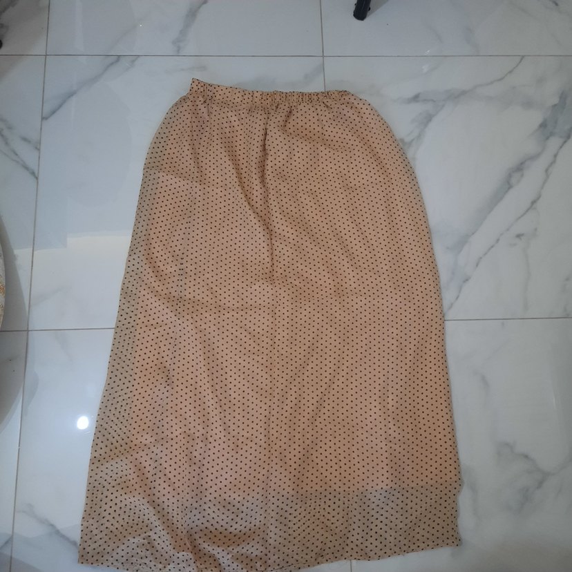 Bej renkli, uzun boy, salaş kesim ve drapeli detaylara sahip, hafif sentetik kumaştan günlük kullanıma uygun kadın eteği.