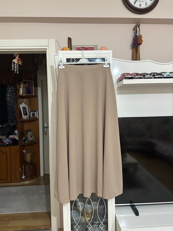 Bej renkte, uzun ve salaş kesimli kadın eteği. Drapeli tasarımı ve düzgün sentetik kumaşıyla minimalist normcore tarzına uygundur. Boyu 99 belli49