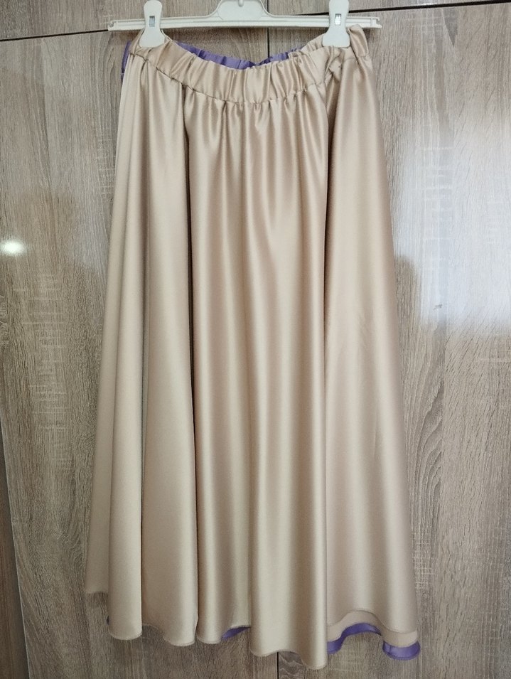 Bej renkli, drapeli ve salaş kesime sahip uzun saten etek. Düz desensiz, günlük kullanıma uygun rahat bir modeldir. hiç kullanılmadı.