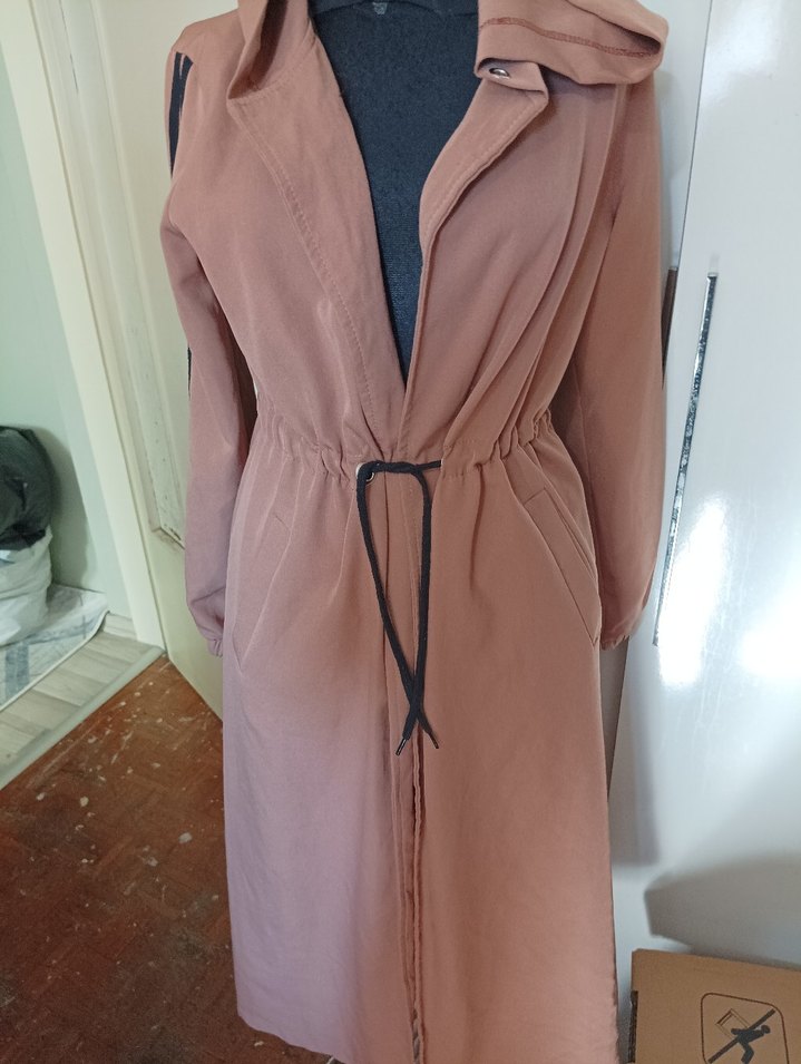 Bej renkli uzun trençkot, salaş kesimi ve drapeli detaylarıyla dikkat çeker. Yumuşak sentetik kumaştan üretilmiş, uzun kollu ve belden bağlamalıdır. Minimalist, desensiz tasarımı günlük şehir şıklığına uygundur. iki KOLTUK ALTI MESAFE 48 cm