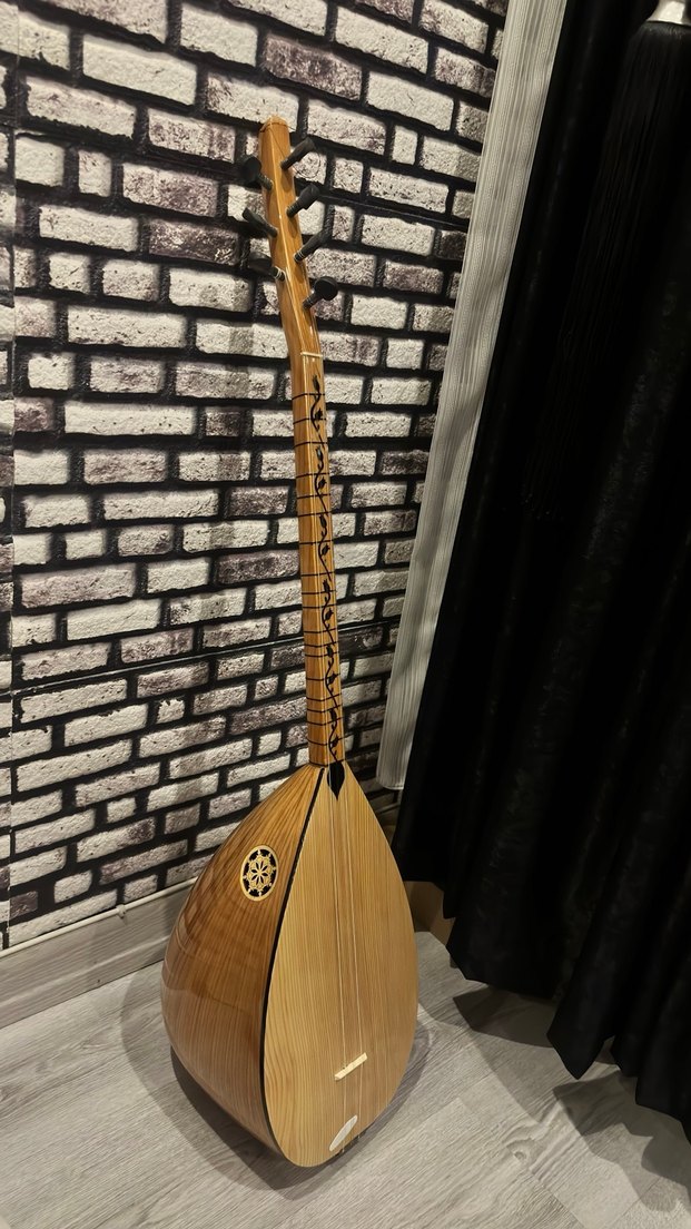 Bej renkte uzun saplı, doğal ahşaptan yapılmış, süslü ses deliklerine sahip bağlama.