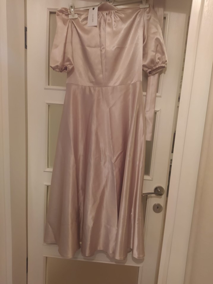 Bej uzun saten elbise, bol kesim ve drapeli tasarıma sahiptir. Kayık yaka ve askılı kolludur, düğünler için modern klasik stil sunar.
