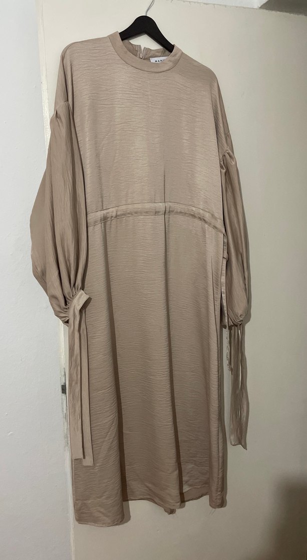Bej uzun saten elbise, salaş kesim ve drapeli detaylara sahiptir. Uzun, bağcıklı kollu ve yüksek yakalıdır