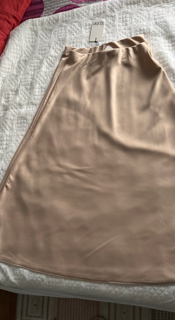 Parlak bej saten kumaştan, salaş kesim ve drapeli uzun etek, sade ve bohem Paris tarzını yansıtıyor. Hiç kullanılmamıştır