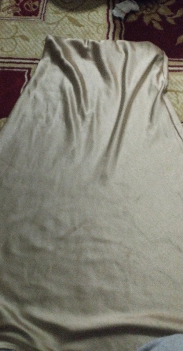 Bu uzun bej etek, saten dokusu ve bol kesimiyle drapeli bir tasarıma sahiptir. Bohem ve retro tarzları tamamlar, düğünler için uygundur.