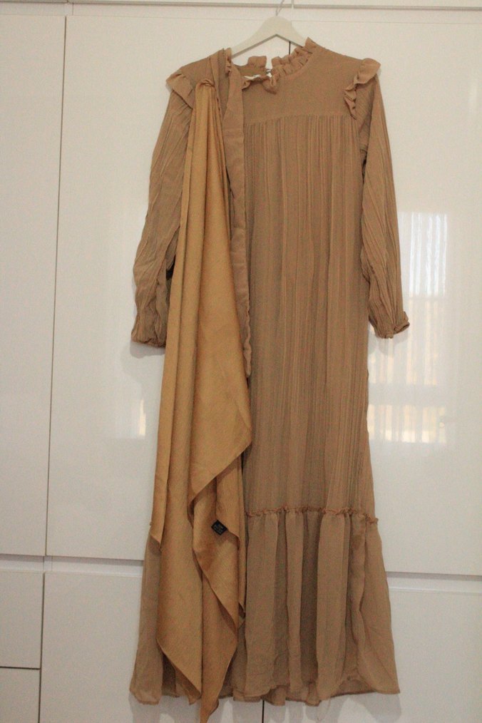 Bej renkli, yüksek yakalı ve bol kesim uzun şifon elbisedir. Drapeli tasarımı ve askılı kolları ile bohem tarzını yansıtır. Günlük kullanıma uygundur. Yaka kısmında tamirlik deformesi vardır.