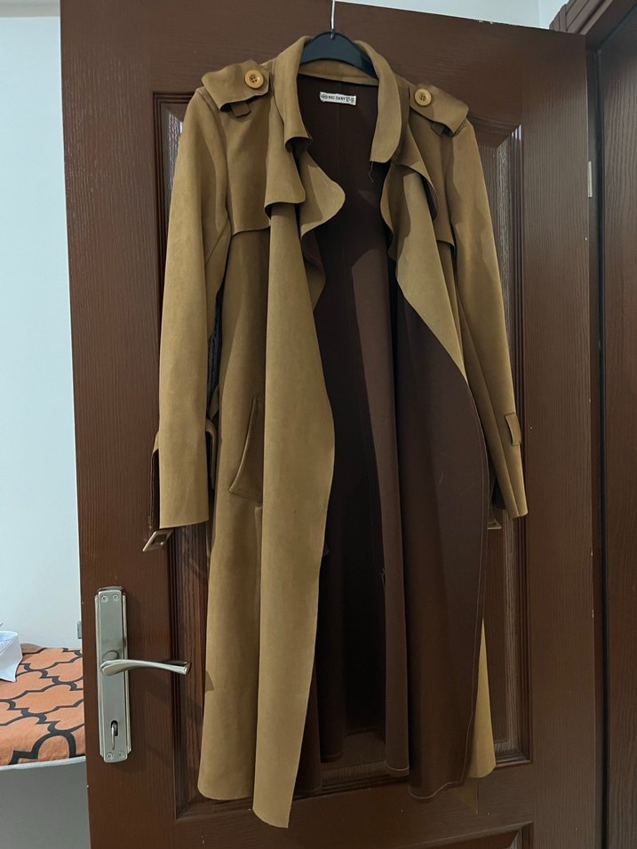 Bej renk, uzun kol ve süet kumaştan yapılmış bu trençkot, yakasında kesikli rever ve drapeli tasarıma sahiptir. Günlük kullanıma uygun, rahat kesim ve desen içermeyen şık bir dış giyimdir.