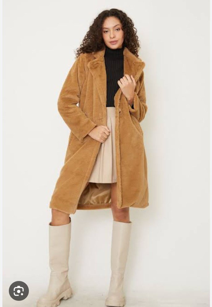 Bej renkli, uzun boylu, süet kumaştan, kürk detaylı, bol kesim kadın kaban. Çentikli yaka ve uzun kolludur, günlük sokak stili için uygundur.