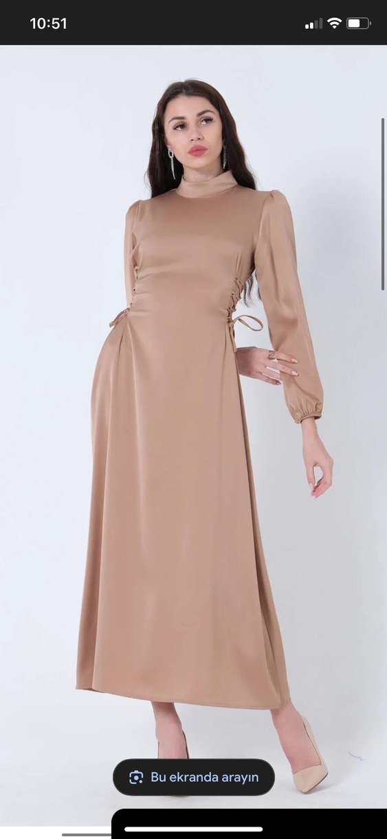 Bej uzun elbise, saten kumaş, drapeli tasarım ve yüksek yakaya sahiptir. Uzun kollu, klasik ve minimalist ofis şıklığı için uygundur. ✨ şalı ile göndereceğim