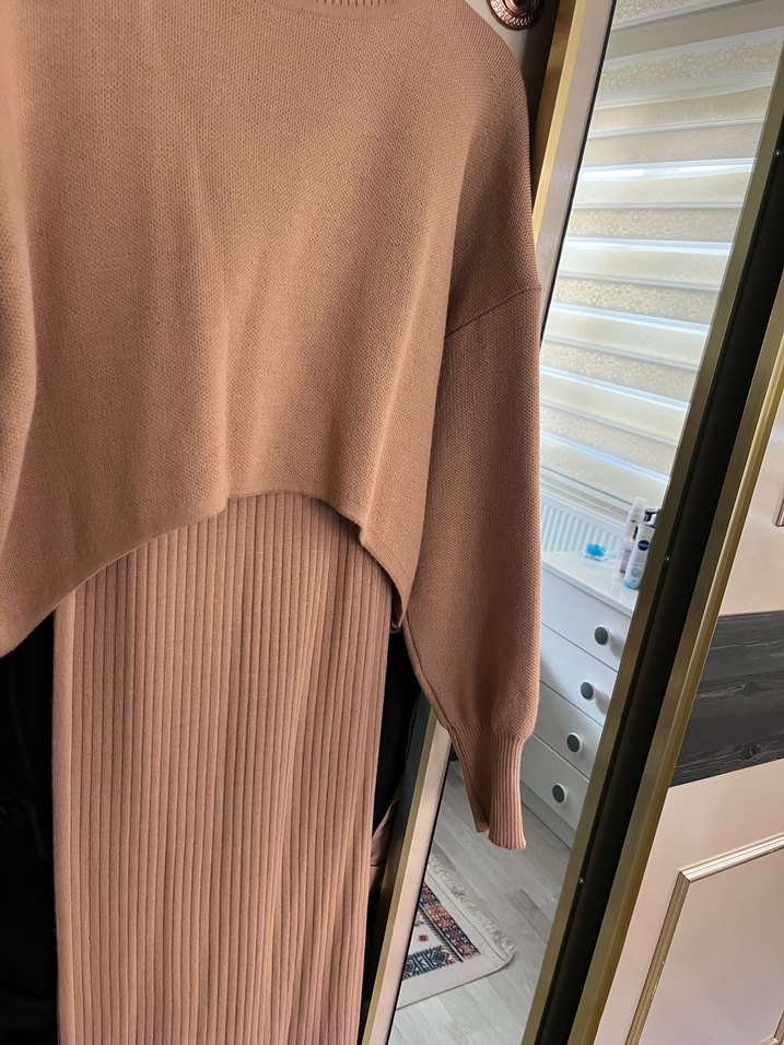Bej renkte, uzun kollu ve yuvarlak yakalı, rahat kesim triko elbise. Yumuşak sentetik kumaştan, günlük kullanıma uygun.