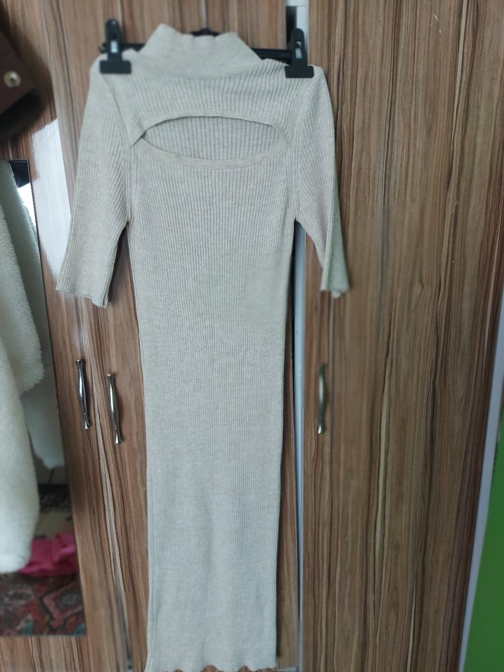 Bej renkte, boğazlı ve uzun kollu, ince kesim uzun triko elbisedir. Rahat ve şık sokak stili için uygundur.