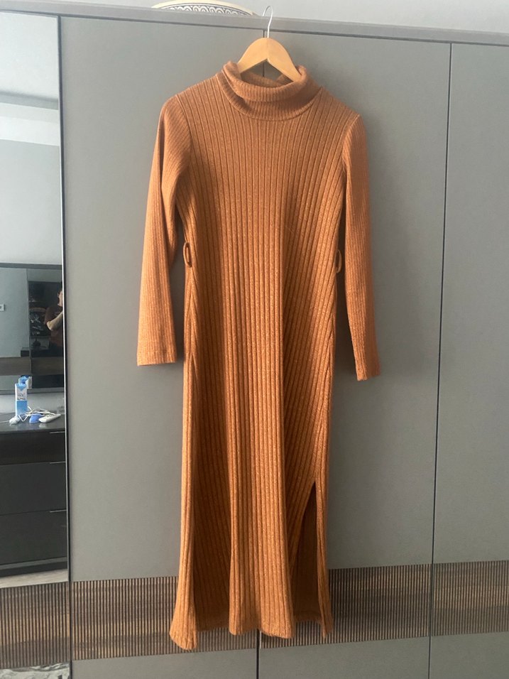 Bej renkte, uzun kollu ve yüksek yakalı, triko kumaştan yapılmış fitted kesim elbise. Rahat ve normcore tarzıyla günlük kullanıma uygundur. Yanlarda yırtmaç bulunur.