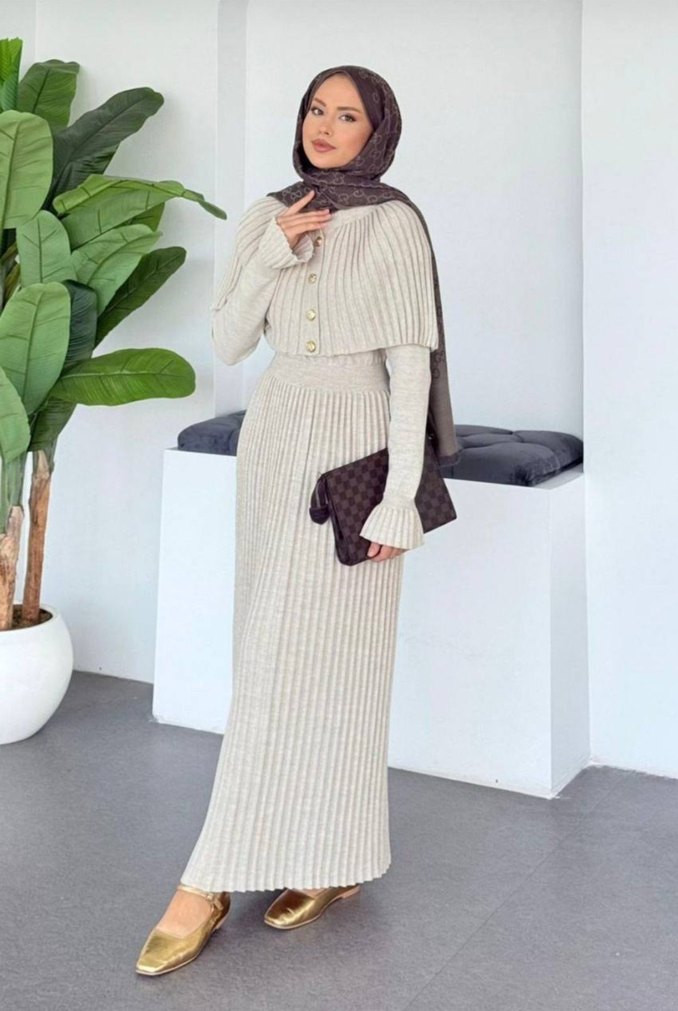 Bej renkli triko kumaştan, yüksek yakalı, uzun kollu ve pilili detaylara sahip uzun elbisedir. Rahat kesimi ve sade tasarımıyla günlük kullanıma uygundur.