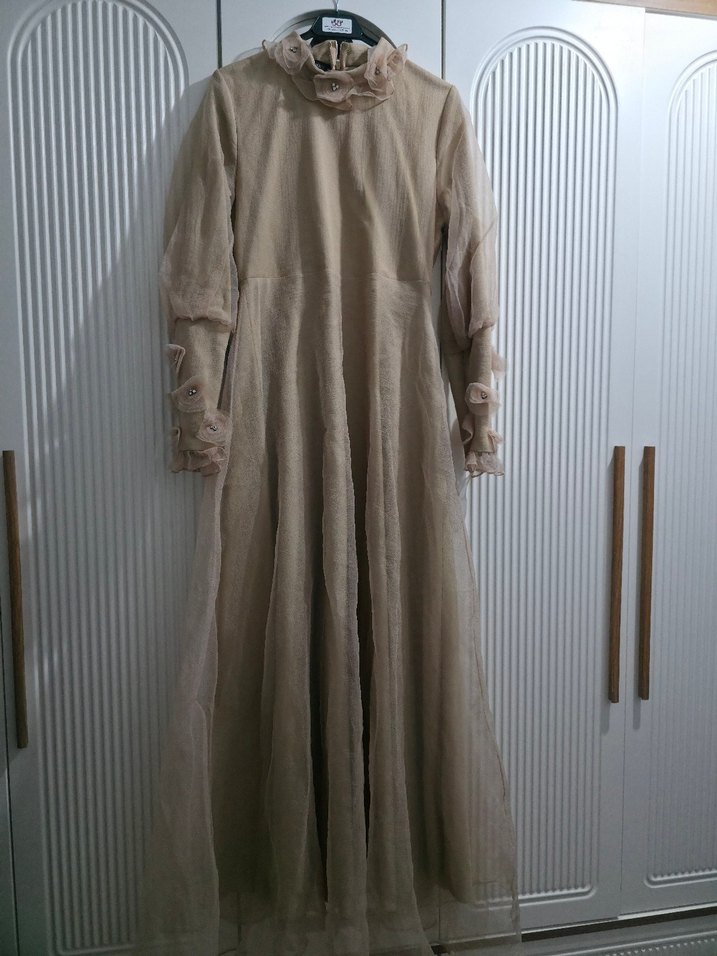 Bej Uzun Tüllü Elbise, Yüksek Yakalı, Salaş Kesim