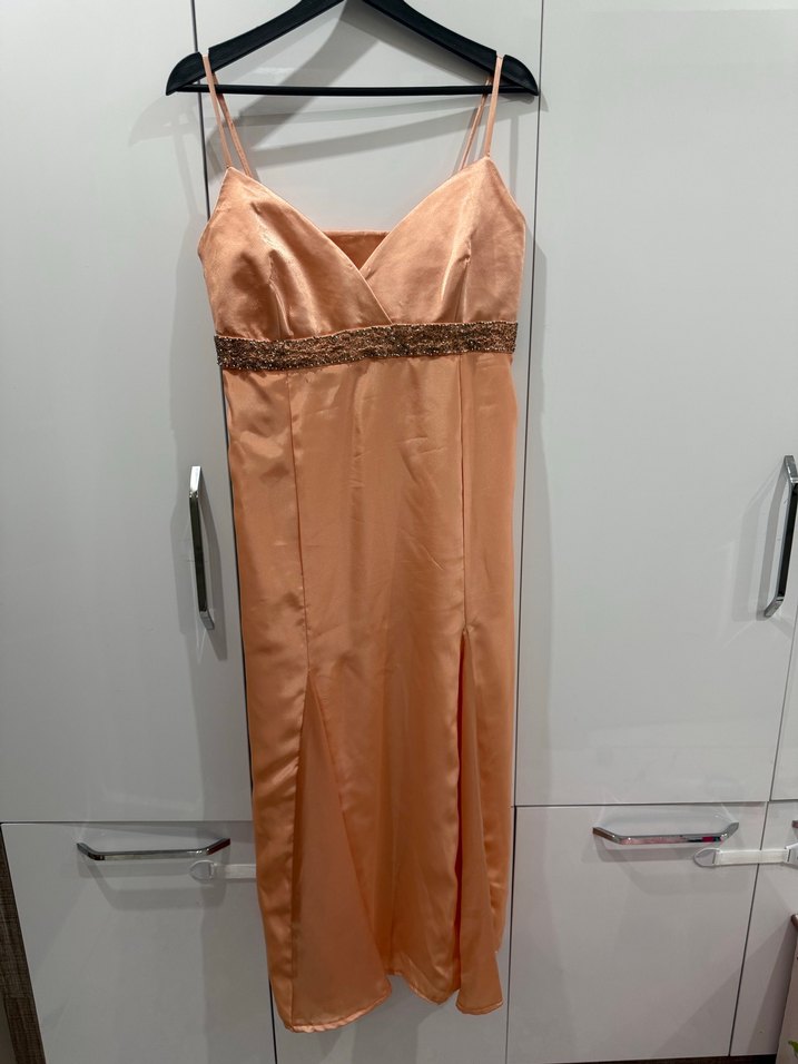 Bej renkli, ince askılı, V yaka ve drapeli tasarıma sahip, vücuda oturan uzun abiye elbise. Parlak kumaşı ve belindeki zarif süsleme ile modern klasik tarzda, düğün için uygun.