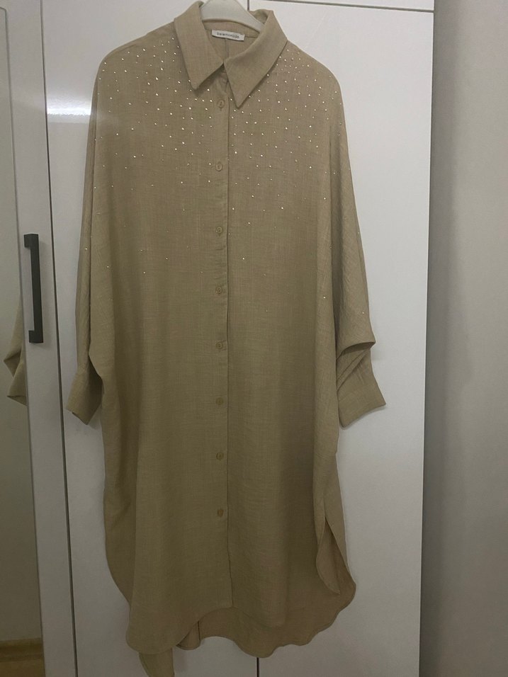 Bej renkte uzun kadın gömleği, düğmeli ve yakalıdır. Bol kesimi ve uzun kolları ile minimalist bohem tarzı yansıtır. Omuzlarda hafif süslemeler bulunur.