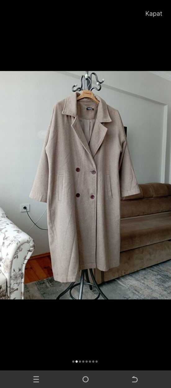 Bej renkte uzun yün kaban, düğmeli ve kesik yaka detaylıdır. Salaş kesimiyle günlük kullanıma uygundur, uzun kolludur ve desensizdir.