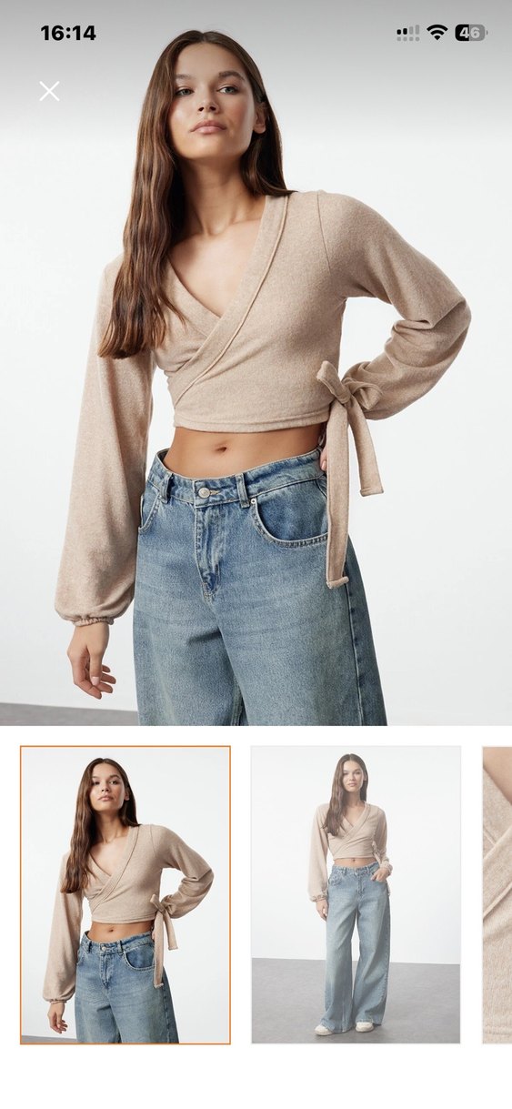 Bej renkte, V yaka ve uzun kollu, belden bağlamalı kadın bluz. Denim kumaştan, bol kesim ve midi boyda, günlük ve sokak stiline uygun.