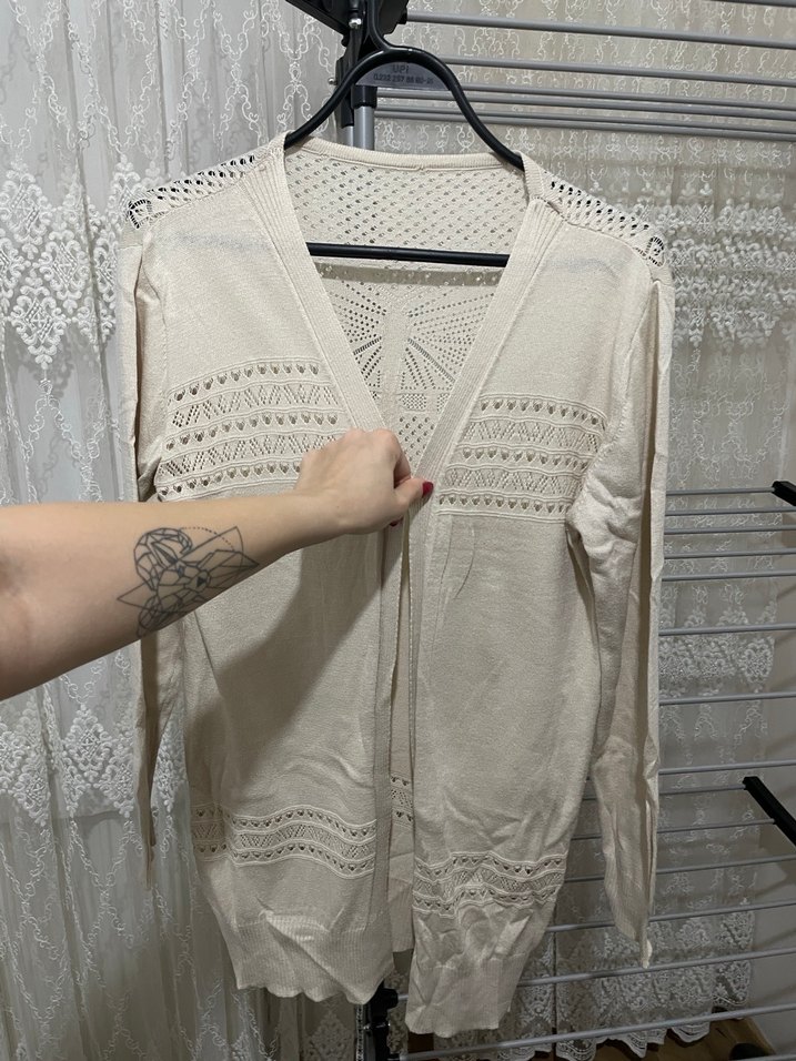 Hafif bej renkte, uzun kollu ve V yakalı, yumuşak örme kumaştan bohem tarzda fitted kesim kadın hırka. İnce örme detaylarla günlük kullanıma uygun.