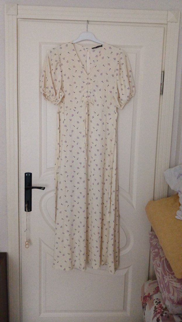 Bej renkte, kısa kollu ve V yakalı bu uzun elbise, dökümlü tasarımı ve bol kesimiyle yumuşak sentetik kumaştan üretilmiştir. Pastel çiçekli deseni günlük kullanıma uygundur.