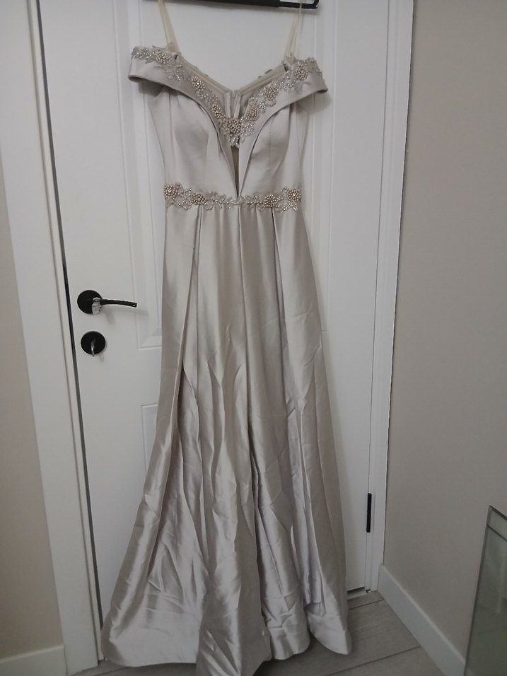 Bej renkte, V yakalı ve drapeli uzun abiye elbise. Kolsuz, vücuda oturan kesimi ve zarif süslemeleriyle özel günler için uygundur.