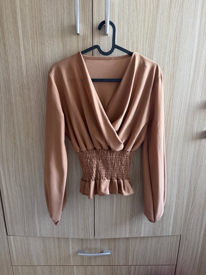 Bej renkte, V yakalı ve uzun kollu bu bluz, drapeli tasarımı ve lastikli beliyle salaş bir kesime sahiptir. Kısa boyda, minimalist tarzda, günlük sokak modasına uygundur. Yumuşak sentetik kumaştan yapılmıştır, pastel tonlarda ve desensizdir.
