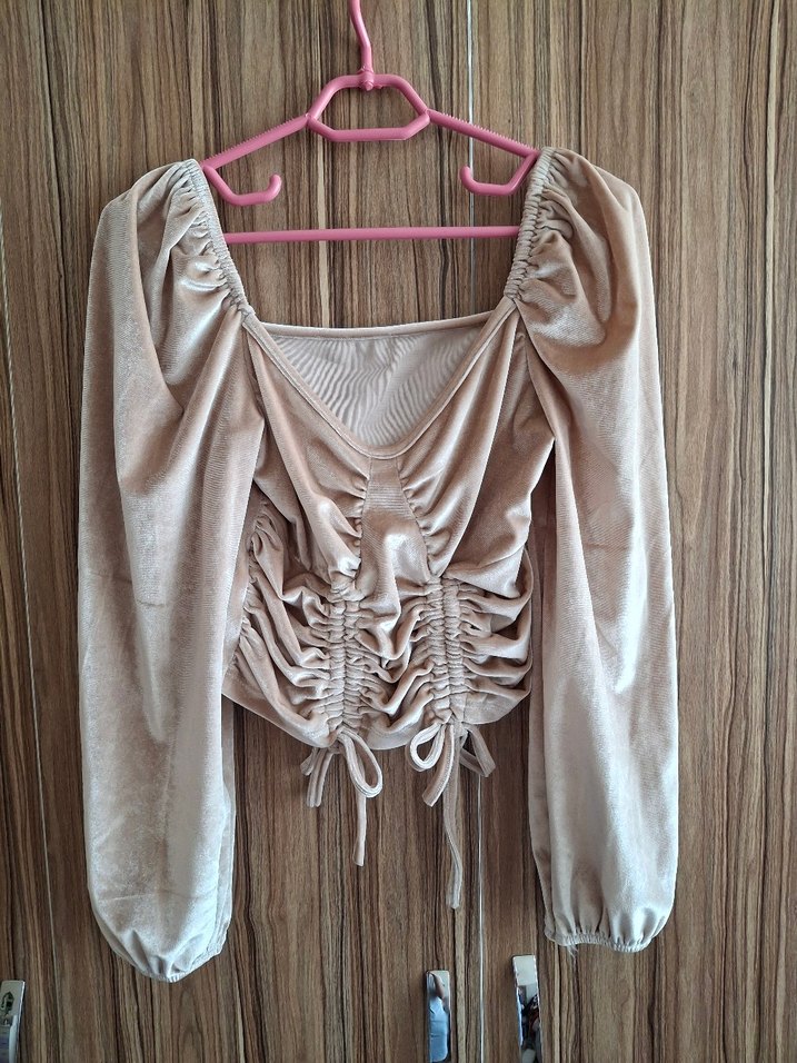 Bej renk, V yakalı ve uzun kollu, drapeli detaylara sahip bol kesim bluz. Yumuşak sentetik kumaştan, bohem tarzına uygun. ✨