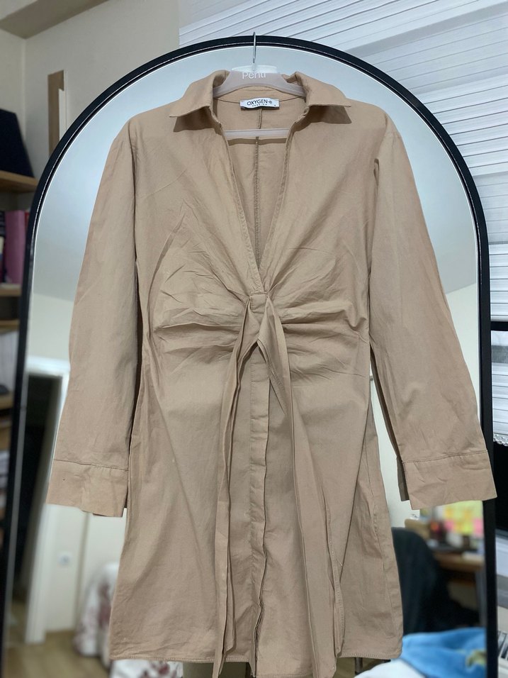 Düğmeli yandan fermuarlı ve bağlama detaylı elbise fermuarın üst kısmında sökük var yırtık değil sökük dikilir elde 1 kez giydim sadece önünde de ekledim minik beyaz bir şey görünüyor ama yıkanınca cıkabilir zaten belli olmuyor yine de defolu diye ekleyeceğim ama önemli bişey yok