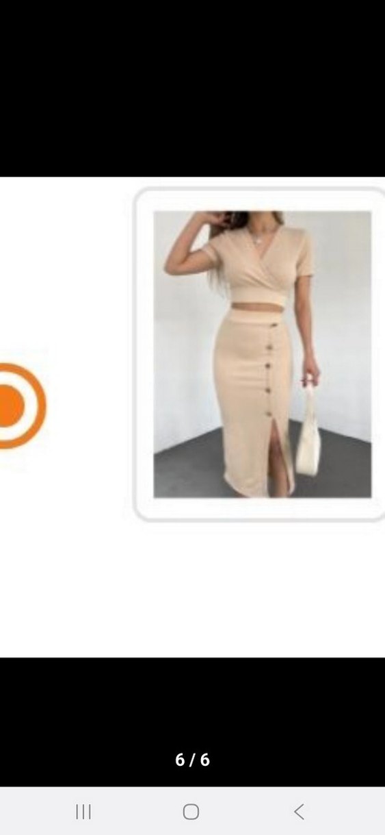 Bej renkli, V yakalı ve kısa kollu ikili takım. Yanında düğme detayları ve yırtmaç bulunur. etek + crop bluz