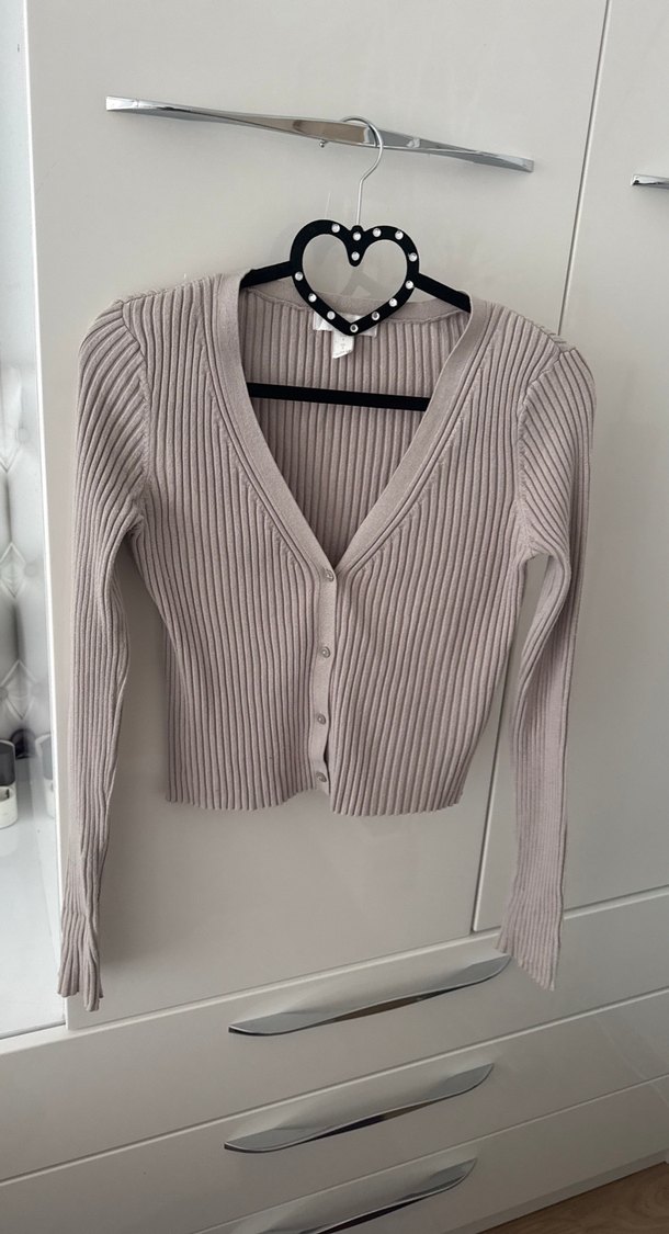 Bej renkte, v yaka ve uzun kollu, düğmeli ince triko hırka. Rahat ve desen içermeyen tasarımıyla günlük sokak stiline uygun.