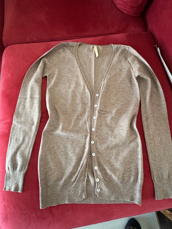 Bej renkte, düğmeli uzun kollu ve ince triko hırka. Solma tülerme yok. Tertemiz.