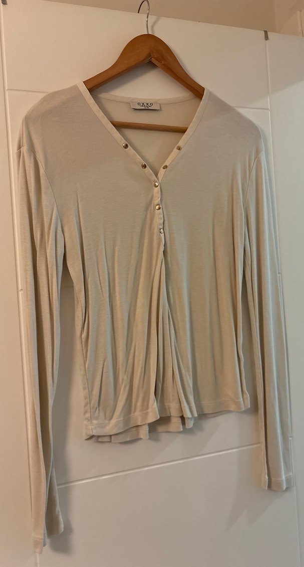 Bej renkli, uzun kollu, V yaka ve düğmeli kadın bluz. Yumuşak keten kumaştan, bol kesim ve normal midi boyda, minimalist günlük stil için uygun.