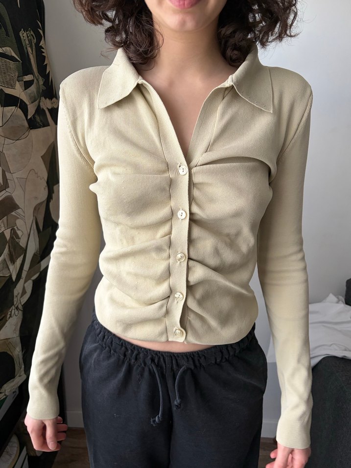 Bej renkte, V yaka ve uzun kollu dar kesim kadın bluz small medium bedenlerine uygun