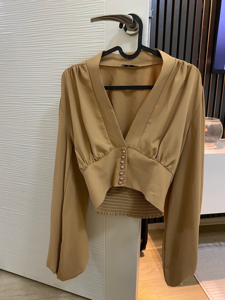 Bej renkli, V yaka ve uzun kollu kadın bluz, düğmeli ön detaylı ve vücuda oturan midi boyda. Parlak, ipeksi kumaştan günlük sokak stili için uygun. ✨