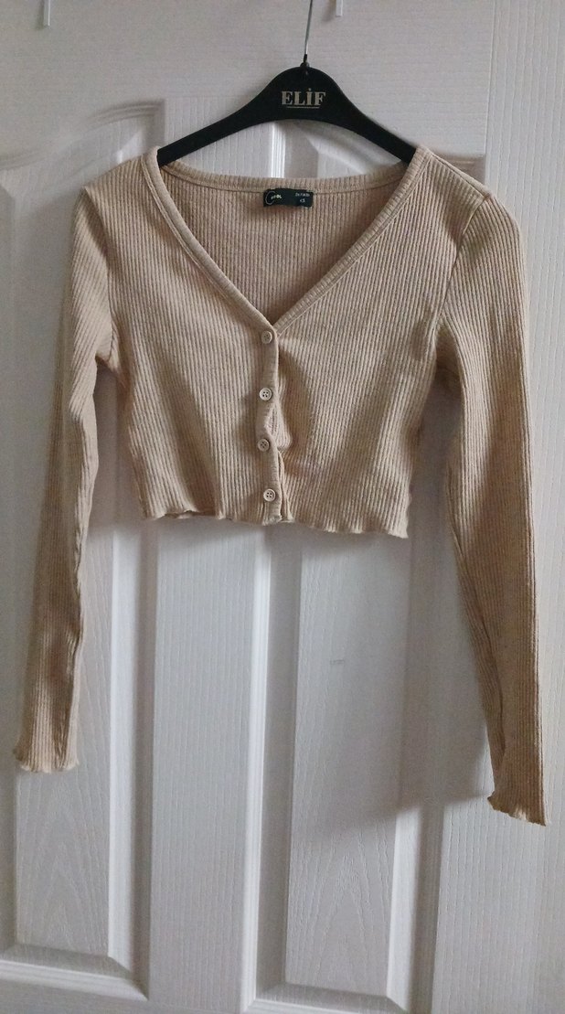 Bej renkli, düğmeli, uzun kollu ve V yakalı triko hırka. Orta boy ve vücuda oturan kesimiyle rahat ve şık bir görünüm sunar. açık göbek modeldir iade kabul edilmeyecek