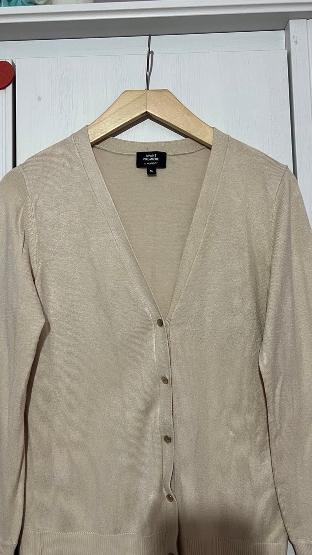Bej renkli, V yakalı ve düğmeli kadın hırka. Keten kumaştan, normal kesim, uzun kollu ve midi boyda, ofis ve günlük kullanım için uygun.