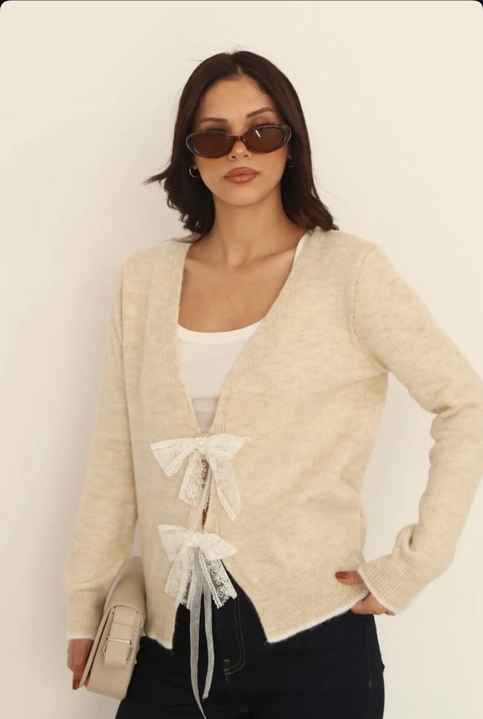 Bej renkte, V yakalı ve uzun kollu, yumuşak örgü kumaştan yapılmış, bol ve midi boy hırka. Önünde iki dantel fiyonk detayı bulunur, günlük kullanıma uygundur.