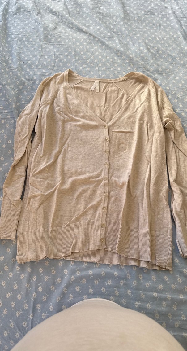 Bej keten kumaştan, uzun kollu, düğmeli ve V yakalı hırka. Rahat, midi boy ve bol kesim, gündelik kullanıma uygun.